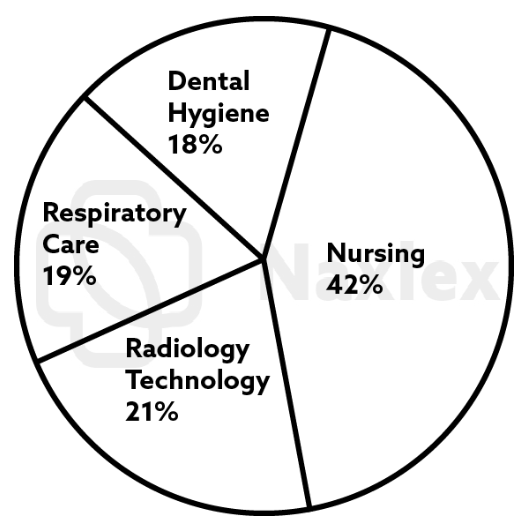 At a nearby community college, 800 students are enrolled in four allied health programs. The pie chart shows the percentage of students in each program. How many students are enrolled in the dental hygiene program, according to the following?