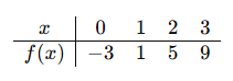 Consider the table of values below and find the linear function f(x) that corresponds to the table.