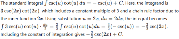 Given the integral ∫3csc(2x)cot(2x) dx, which of the following correctly applies the antiderivative rule and accounts for the constant multiple and chain rule?
