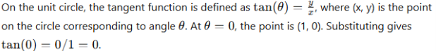 Explain why tan(0)\tan(0)tan(0) equals 0 in terms of the unit circle definition of trigonometric functions.