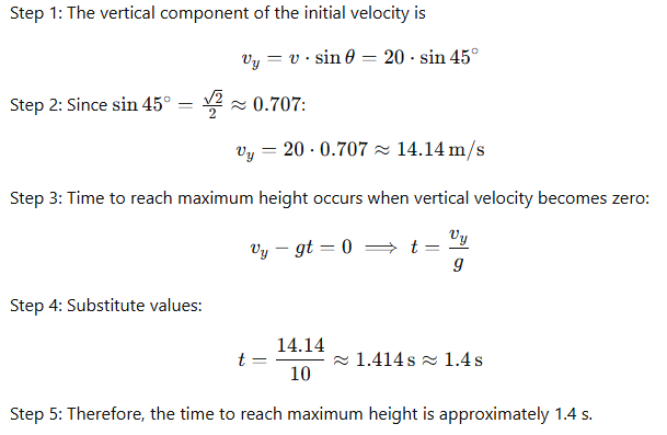 A teacher models quadratic functions with projectile motion. If a ball is thrown with initial velocity 20 m/s at 45°, what is the time to reach maximum height (g = 10 m/s²)?