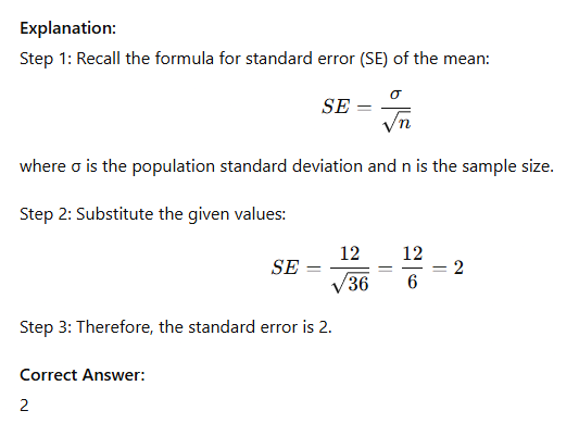 A teacher uses sampling. A population has mean 50, sample size 36, sample mean 52. What is the standard error if σ = 12?