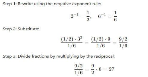 Simplify the expression: (2⁻¹ × 3²) / (6⁻¹).