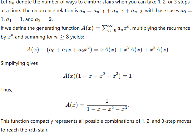 What is the generating function for the number of ways to climb n stairs taking 1, 2, or 3 steps at a time?