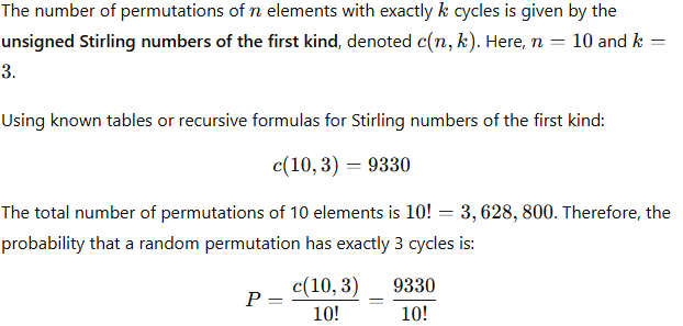 What is the probability that a random permutation of {1,2,…,10} has exactly 3 cycles?