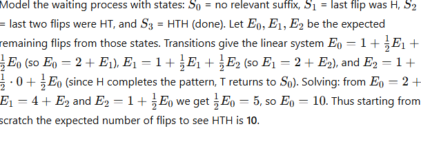 What is the expected number of coin flips needed to get the sequence HTH?