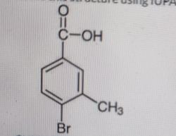 The parent structure is benzoic acid (a benzene ring with a –COOH group). That –COOH group is automatically carbon 1. We then number the ring to give the lowest possible locants to the substituents. Doing this places a methyl group on carbon 3 and a bromo group on carbon 4, giving the name 3-methyl-4-bromobenzoic acid. The other names either misnumber the ring or use nonstandard parent names.