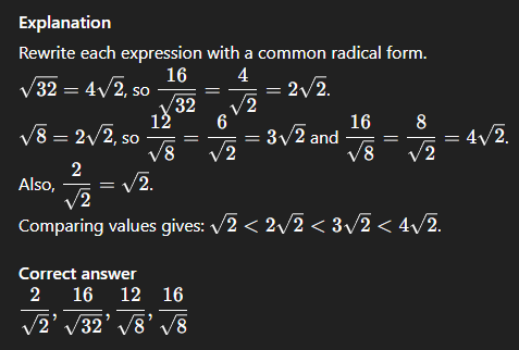 To determine the correct order from least to greatest, compare the decimal numbers and the square root of 5 (approximately 2.23607). Start with the decimals: 2.2356 is the smallest as its digits are 2.2356, followed by 2.23565 (which adds a 5 in the fifth decimal place), then 2.2359 (which has a 9 in the fourth decimal place, making it larger than the others). Next, compare these to √5 (2.23607), which is greater than 2.2359 because 2.23607 exceeds 2.2359 at the fourth decimal place. Thus, the order 2.2356, 2.23565, 2.2359, √5 is correct as it progresses from the smallest to the largest value.