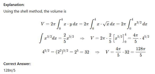 Volume: rotate y = √x, x= 0 to 4, about y-axis (shells)?