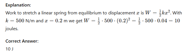Work: stretch spring 0.2 m beyond natural, k = 500 N/m, work = ?